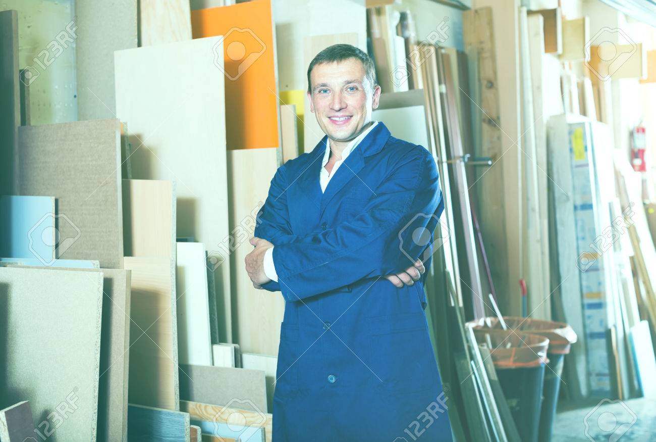 Professionelle Arbeiter Stehend Mit Sperrholz Stücke In Bilderrahmen