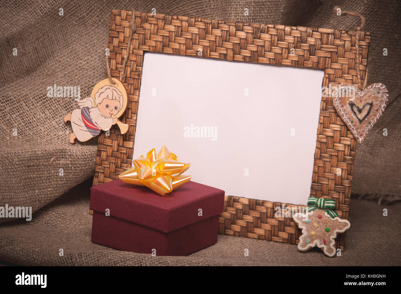 Desktop Bilderrahmen Mit Geschenkbox Auf Leinen Stockfoto Bild